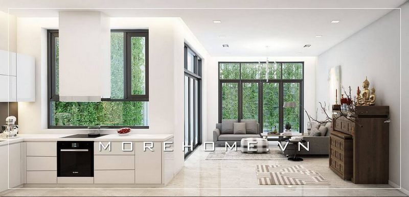 Thiết kế nội thất hiện đại, sang trọng và đẹp mắt cho không gian nhà phố, biệt thự bao gồm phòng khách liền bếp ăn.
